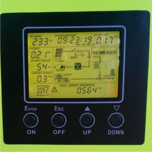 - Большой жидкокристаллический дисплей отображает всю основную информацию о работе системы солнечного электроснабжения